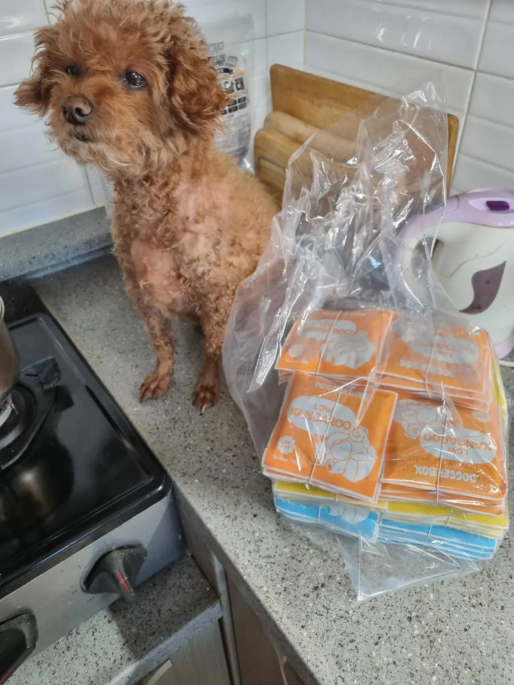 안녕하세요-! 매번 정기배송으로 저희 집 강아지 갈색푸들 민땅콩의 식단으로 저단백질•저지방 신장 케어 화식을 주문하고있는 보호자입니다☺️ 한번 주문할때 엄청 많은 양의 화식을 주문하고있습니다. 그럼에도 항상 배송온걸보면 꼼꼼하게 포장되어서 와서 믿고 먹일수있다는 신뢰를 갖게 됩니다ㅎㅎ! 양을 워낙 많이 시켜서 냉동실 큰 서랍 한칸은 도그박스 전용으로, 저단백질•저지방 신장케어 화식만 보관하고있습니다. 그래야 어떤 종류가 얼마나 남았는지, 총 갯수가 얼마나 남았는지 파악하기 쉽거든요. 쉬는 날 없이 일하느냐고 저희 땅콩이의 밥 담당은 요즘 엄마가 해주고 계신데요. 신장 케어를 해야하는 강아지이다보니 화식에 물을 조금씩 추가로 넣어 미리 잠깐 해동해둔 화식을 전자렌지 10초 돌려서 찬기가 없게 만든 후, 먹을수있게 주고있어요. 음수량도 늘려야하고, 단백질도 저단백질로 먹여야하고 하다보니ㅎㅎ 그럼에도 저희 땅콩이는 도그박스 화식을 아주 아주 잘 먹어주고있어요! 워낙 허겁지겁 먹는 땅콩이라서 얼굴과 입 주변에 묻지않도록 한숟가락씩 주면 허겁지겁 먹다보니 아랫입술에만 조금 묻어있어서 얼굴 전용 빗이나 손수건으로 정리해주고있어요! 허겁지겁 먹는다는건 도그박스 화식이 너무 맛있다는거겠죠. 다행이에요. 신부전이 있는 강아지들은 먹는걸 거부한다는데, 걱정과 달리 너무 잘 먹어주고있습니다. 앞으로도 도그박스를 믿고 쭉 정기배송 주문할테니, 화식이 녹지않도록 포장 꼼꼼히 부탁드리며, 이벤트나 서비스도 많이 생겼으면 좋겠습니다! 사료를 먹일때와 달리, 확실히 비용부담은 있는 편이라서요 흑흑ㅠㅠ 동영상은 음수량 늘리려고 물 섞어서 먹이는 영상이고, 사진은 화식 먹을시간이면 기가막히게 배꼽시계인지 밥 달라고 시위하는거에요ㅋㅋ